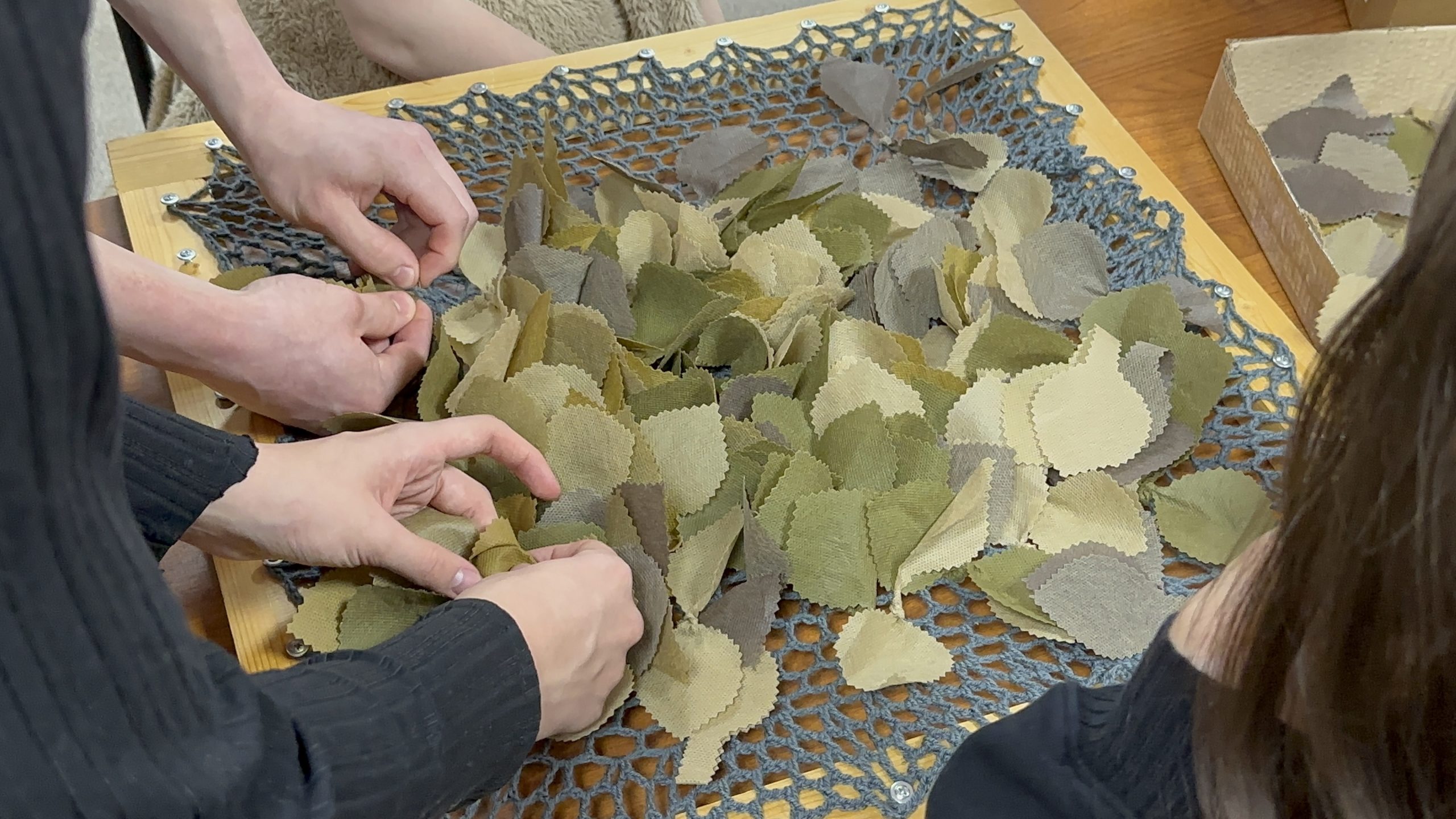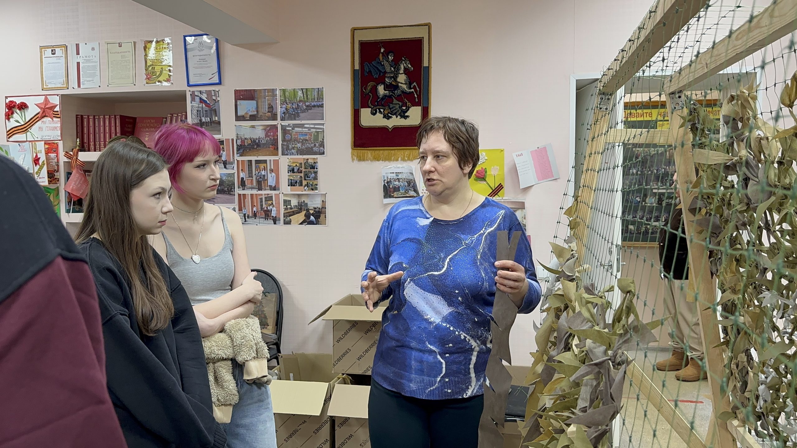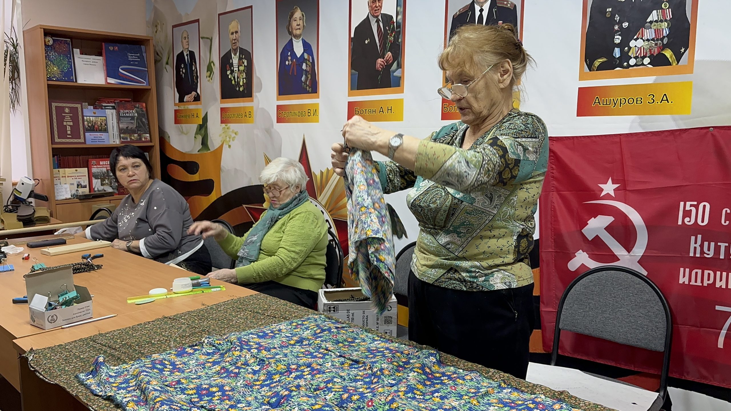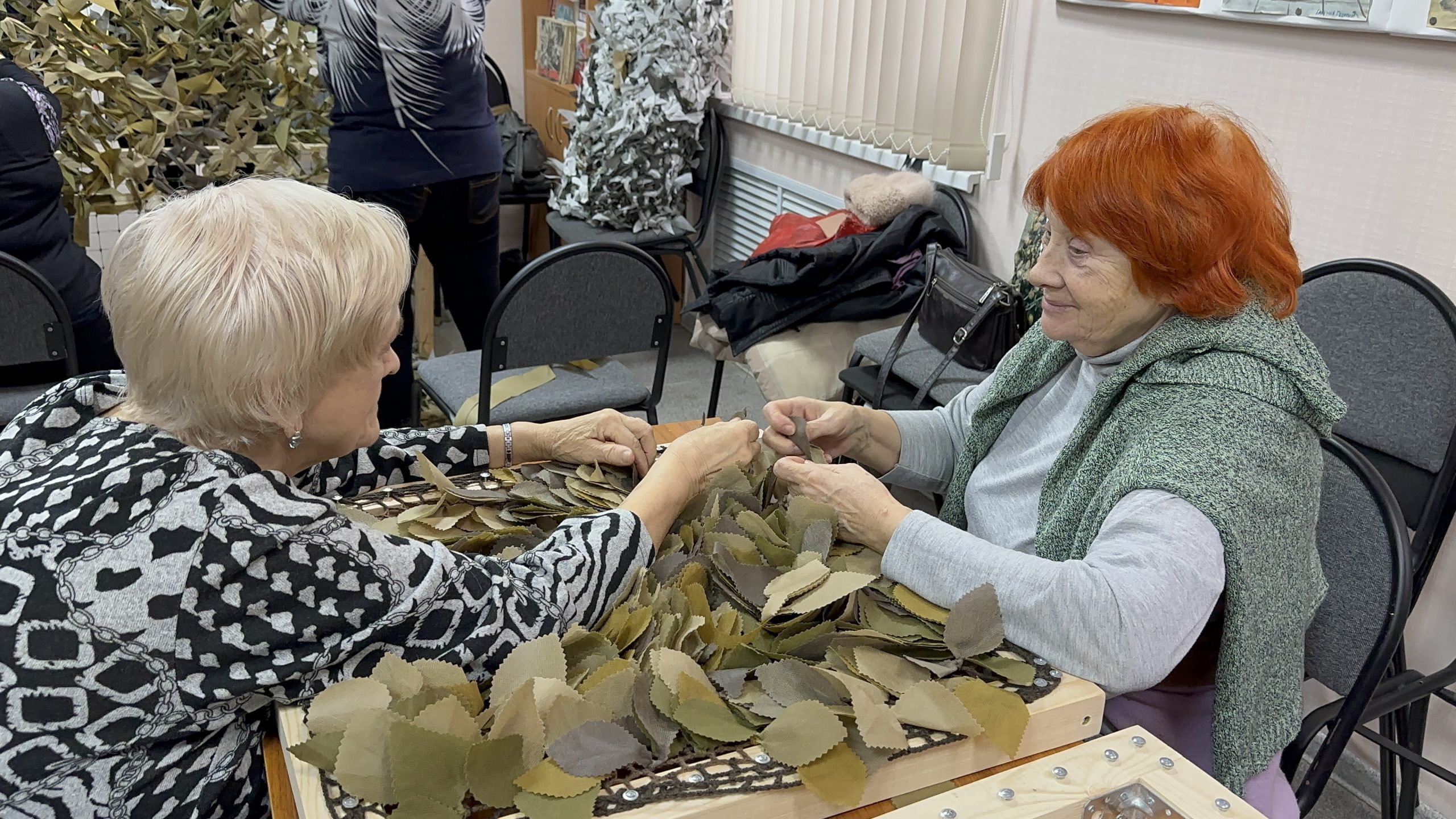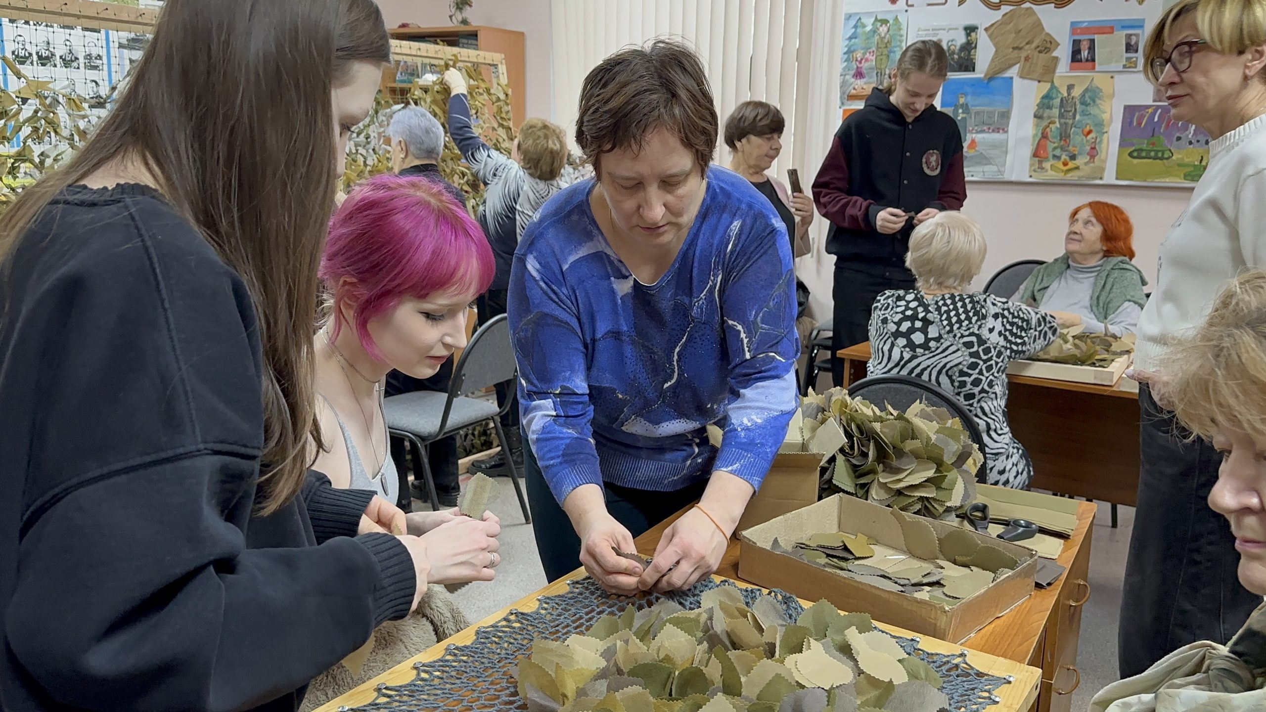 Движение «По ZOVу сердца» с декабря 2024 года собирает неравнодушных жителей района в стенах помещения Совета ветеранов. Волонтеры ежедневно работают над созданием маскировочных сетей, нашлемников, антидроновых завес и спасательных браслетов.